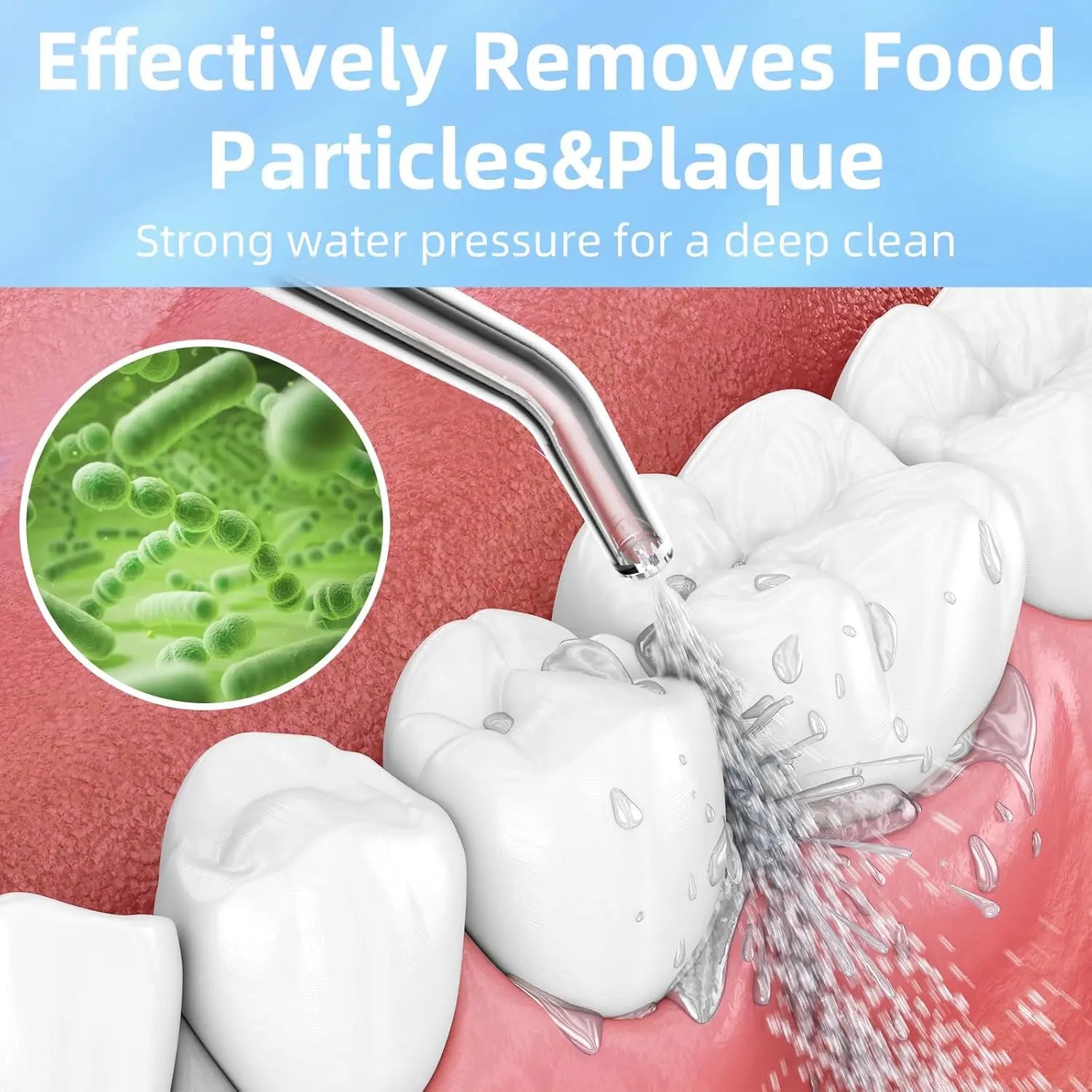 - Battery-free and portable: you get a steady water stream that cleans between your teeth and under the gumline, wherever you are, whether at home or on the go.